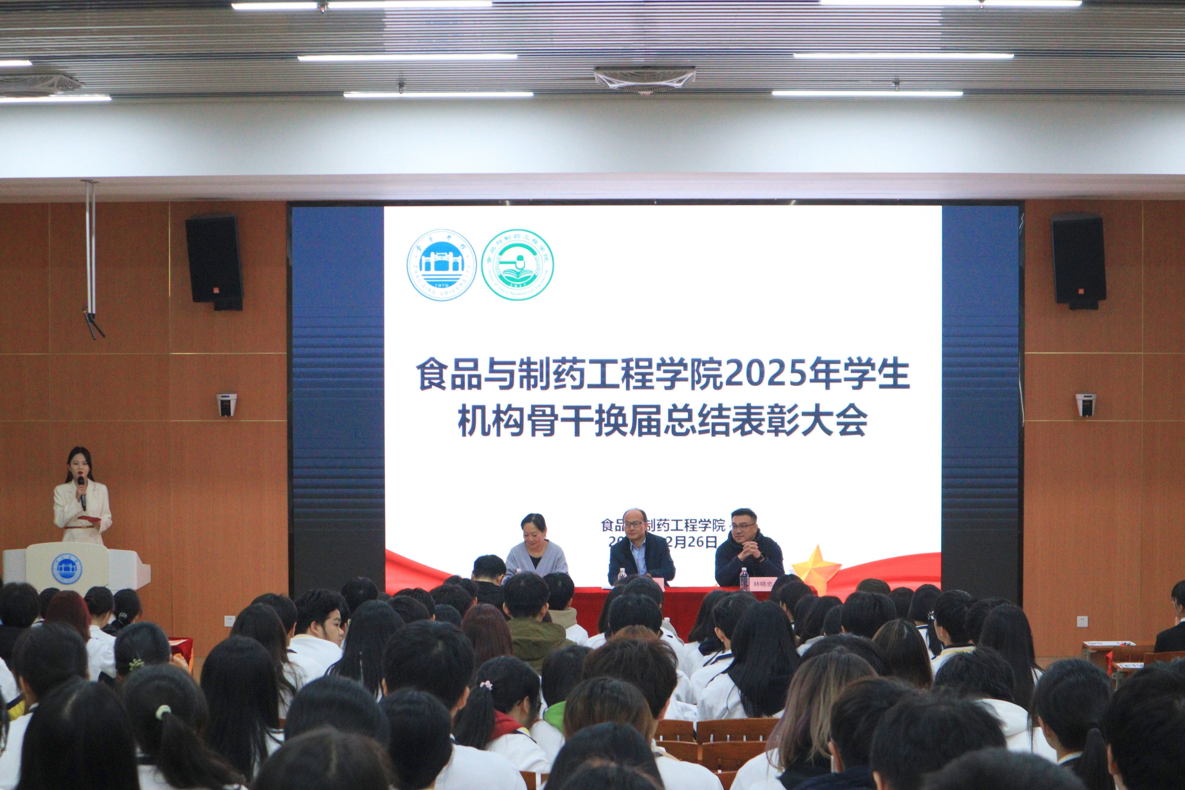 12月26日晚,食品与制药工程学院在第二教学楼704室举行2025年学生机构骨干换届总结表彰大会,学院领导班子及辅导员和学生机构骨干共200余人出席会议。